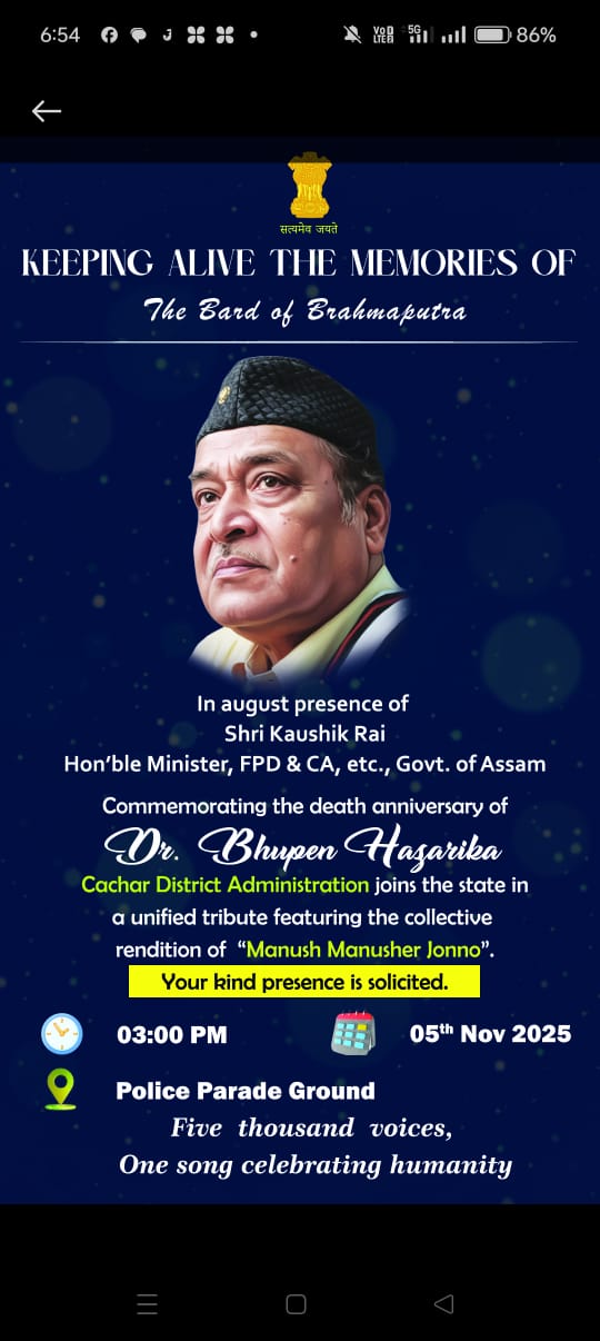 ওয়েটুবরাক, নভেম্বর ৫:--আজ ৫ নভেম্বর বিকেল ৩টায় শিলচর পুলিশ প্যারেড গ্রাউন্ডে প্রতিধ্বনিত হবে ৫ হাজার কণ্ঠের এক অনন্য সুর “মানুষ মানুষের জন্য”। মহান সঙ্গীতগুরু, ভারতরত্ন ড. ভূপেন হাজারিকার মৃত্যুবার্ষিকী উপলক্ষে কাছাড় জেলা প্রশাসনের উদ্যোগে আয়োজিত হতে চলেছে এই ঐতিহাসিক সাংস্কৃতিক শ্রদ্ধাঞ্জলি অনুষ্ঠান। মানুষের ঐক্য, প্রেম, মানবতা ও সামাজিক সম্প্রীতির বার্তা বহন করবে এই মিলনোৎসব, যেখানে যোগ দেবেন জেলার নানা স্তরের মানুষ, স্কুল-কলেজের ছাত্রছাত্রী, স্বেচ্ছাসেবী সংগঠন, সাংস্কৃতিক প্রতিষ্ঠান, এনসিসি, এনএসএস, এএসএলআরএম দল, চা-বাগান শ্রমিক, সরকারি কর্মচারী থেকে শুরু করে সাধারণ নাগরিক সকলেই।