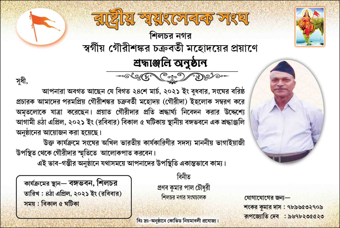 ওয়েটুবরাক, ৪ এপ্রিল: রাষ্ট্রীয় স্বয়ংসেবক সংঘের প্রচারক, বরাক উপত্যকার কৃতী সন্তান  গৌরীশঙ্কর চক্রবর্তীকে শ্রদ্ধা জানাতে আজ রবিবার বিকাল ৫টায় শিলচর বঙ্গভবনে এক সভার আয়োজন করা হয়েছে৷ সদ্যপ্রয়াতের মূল স্মৃতিচারণ করবেন সংঘের কেন্দ্রীয় কার্যবাহী কমিটির সদস্য ভাগাইয়াজি৷ শিলচর নগর সংঘ চালক প্রণবকুমার পালচৌধুরী ওই শ্রদ্ধাঞ্জলি অনুষ্ঠানে সকলের উপস্থিতি কামনা করেছেন৷