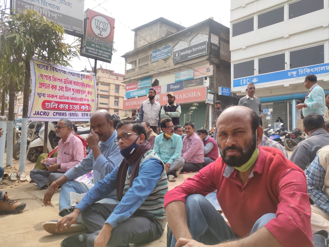 শিলচরে সাংসদের বাড়ির সামনে কাগজ কল কর্মীদের ধর্না