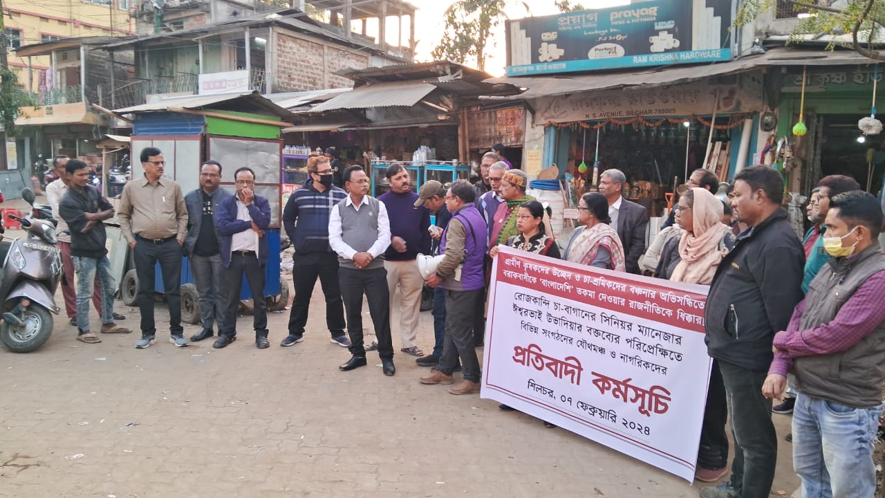 ওয়েটুবরাক, ৭ ফেব্রুয়ারি : বরাক উপত্যকার বাঙালিদের ‘বাংলাদেশি’ তকমা দিয়ে রোজকান্দি চা-বাগানের সিনিওর ম্যানেজার ঈশ্বরভাই উবাদিয়ার বক্তব্যের পরিপ্রেক্ষিতে আজ শিলচরের রাঙ্গিরখাড়িতে বিভিন্ন সংগঠনের যৌথ প্রতিবাদী সভা অনুষ্ঠিত হয়। সভার শুরুতে ফোরাম ফর সোশ্যাল হারমনির পক্ষে সভার উদ্দেশ্য ব্যাখ্যা করেন অরিন্দম দেব। সিআরপিসিসি-র সভাপতি ড. তপোধীর ভট্টাচার্যের লিখিত বার্তা পড়ে শোনানো হয় সভায়। এর পর একে একে বক্তব্য রাখেন সমাজকর্মী আশু পাল, উত্তরপূর্ব বাংলা সাহিত্য সভার পক্ষে মিহির নন্দী, ভাষা আইন সুরক্ষা সমিতির পক্ষে হিল্লোল ভট্টাচার্য, উনিশে মে উদযাপন কমিটির পক্ষে সাধন পুরকায়স্থ, পিপলস সায়েন্স ফোরামের পক্ষে কৃষাণু ভট্টাচার্য, মার্চ ফোর সায়েন্সের পক্ষে কমল চক্রবর্তী, বিডিএফ-এর পক্ষে জয়দীপ ভট্টাচার্য, সমাজকর্মী সীমান্ত ভট্টাচার্য, সাংবাদিক ও সমাজকর্মী দিলীপ সিংহ এবং হিউম্যান সায়েন্স ফোরাম, নারী মুক্তি সংস্থা, সম্মিলিত সাংস্কৃতিক মঞ্চ সহ বিভিন্ন সামাজিক সংস্থার প্রতিনিধি ও অন্যান্য সমাজকর্মীরা বক্তব্য রাখেন৷ সভা পরিচালনা ও ধন্যবাদসূচক বক্তব্য রাখেন সভার অন্যতম আহ্বায়ক কোরাস-এর বিশ্বজিৎ দাস। সমাজকর্মী শিক্ষক মন্মথ নাথ আজ প্রয়াত হয়েছেন, তার প্রয়াণে শোক প্রস্তাবও গৃহীত হয়।