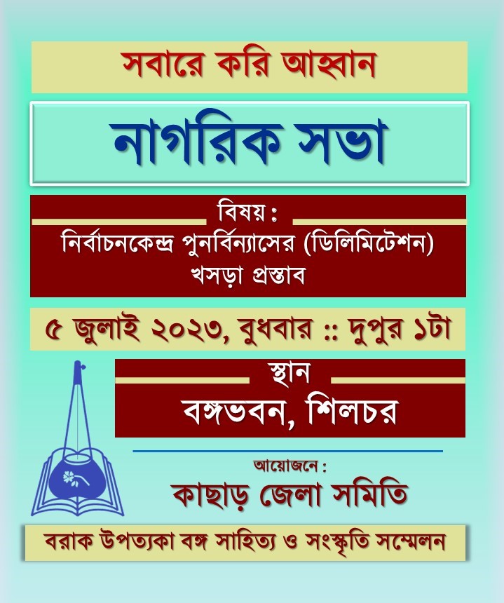 বরাক উপত্যকা বঙ্গ সাহিত্য ও সংস্কৃতি সম্মেলন উপত্যকার জনগণকে নিয়ে অগণতান্ত্রিক এই সীমানা পুনর্নিধারণ প্রয়াসের বিরুদ্ধে শান্তিপূর্ণ প্রতিরোধ গড়ে তুলতে, এবং এ খসড়ার পরিবর্তন চেয়ে নির্বাচন কমিশনের কাছে ব্যাপকভাবে দাবিপত্র প্রদান করার লক্ষ্যে আগামী ৫ জুলাই বুধবার দুপুর একটায় বঙ্গভবন সভাকক্ষে সম্মেলনের কাছাড় জেলার গ্রাম ও শহরের বিশিষ্ট নাগরিক, শিক্ষাবিদ, বুদ্ধিজীবী, সমাজসেবী, শিল্পী, সাহিত্যিক সহ সম্মেলনের সদস্যদের নিয়ে একটি নাগরিক সভা আহ্বান করা হয়েছে। দলমতের উর্ধ্বে এ সভায় উপস্থিত থেকে সবাইকে নিজের সুচিন্তিত মতামত ও পরামর্শ প্রদানের জন্য আন্তরিক আবেদন জানানো হয় ।
