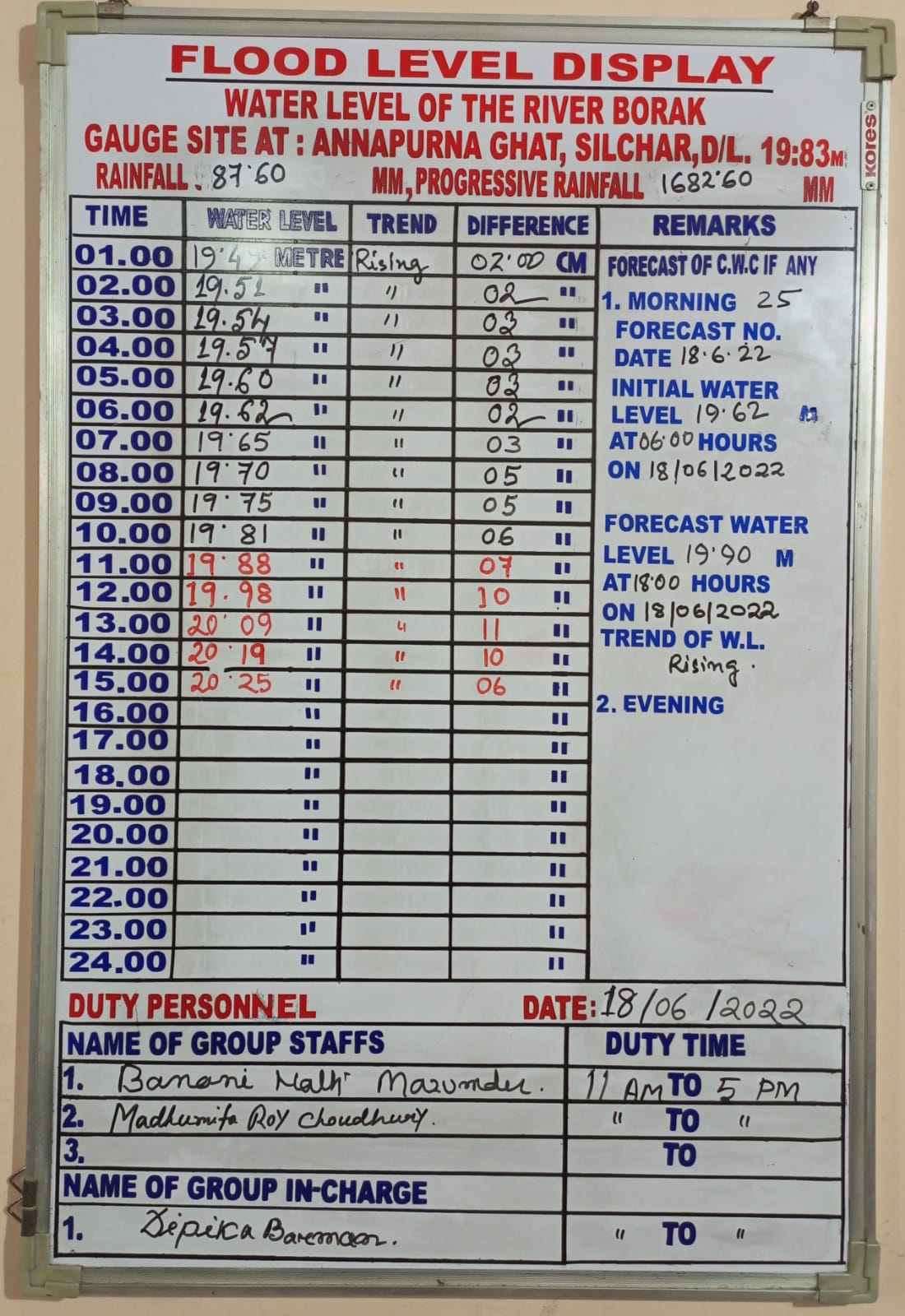 ওয়েটুবরাক, ১৮ জুন : দশ-এগারো সেমি করে বাড়ার পর বেলা দুইটা থেকে তিনটার মধ্যে জলস্তর বৃদ্ধির প্রবণতা কিছুটা কমেছে৷ শেষ ঘণ্টায় জল বেড়েছে ৬ সেমি৷ তাতে অন্নপূর্ণা ঘাটে জল বেড়ে দাঁড়িয়েছে ২০.২৫ মিটারে৷ শহরের চারদিকে এখন জল আর জল৷ বহু এলাকায় বাড়িঘরে জল ঢুকে পড়েছে৷ স্লুইস গেট বন্ধ থাকায় বাড়ছে জমা জল৷ উদ্বেগ-আতঙ্কে বরাক উপত্যকার মানুষ৷