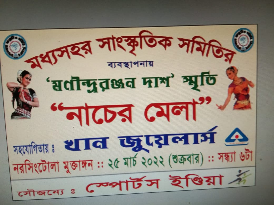 ওয়েটুবরাক, ১৪ মার্চ : নাচের মেলার আয়োজন করছে মধ্যশহর সাংস্কৃতিক সমিতি৷ আগামী ২৫ মার্চ সন্ধ্যা ছয়টায় নরসিংটোলায় অনুষ্ঠিত হবে মণীন্দ্ররঞ্জন দাশ স্মৃতি নাচের মেলা৷ জানিয়েছেন মধ্যশহর সাংস্কৃতিক সমিতির সম্পাদক অজয় চক্রবর্তী৷