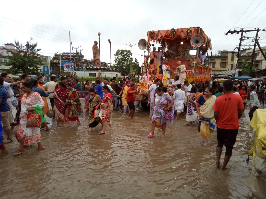 ১২ জুলাইঃ নালা-নর্দমা উপচে পড়া জল আর তাতে মিশে থাকা জঞ্জাল মাড়িয়েই বাড়ি ফিরলেন জগন্নাথদেব। সঙ্গে বলরাম, সুভদ্রা। আটদিন আগে যখন রথে চড়ে মাসীর বাড়ির উদ্দেশে রওয়ানা হয়েছিলেন তাঁরা, বরাক উপত্যকার কোথাও বৃষ্টি ছিল না। ফেরার পথেই বিপত্তি। দুদিন ধরে প্রবল বর্ষণ। শিলচর, করিমগঞ্জ, হাইলাকান্দি সব শহরে নালা-নর্দমা উপচে জল চলেছে রাস্তার ওপর দিয়ে। শিলচর শহরের সর্বত্র জল থইথই অবস্থা। নর্দমা আর জঞ্জালে একাকার। এ অবস্থাতেই শাস্ত্রীয় রীতি মেনে শুক্রবার উল্টোরথ বেরোয়। প্রায় সকলের রথ ওই নোংরা জল পেরিয়েই নিজেদের আশ্রমে পৌঁছায়।