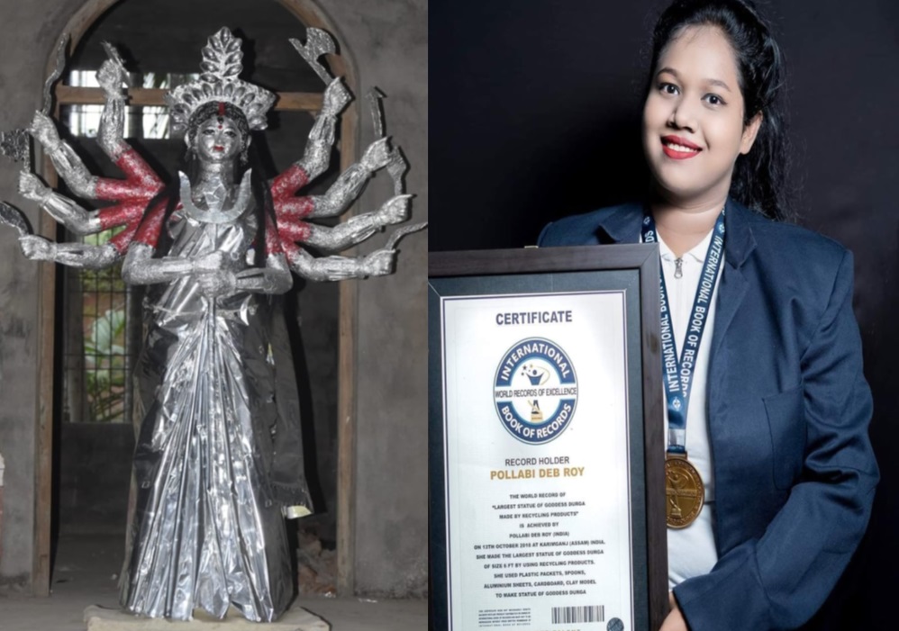 পরিত্যক্ত প্লাস্টিক, চামচের দীর্ঘতম দুর্গাপ্রতিমা, করিমগঞ্জের পল্লবীর ইন্টারন্যাশনাল রেকর্ড