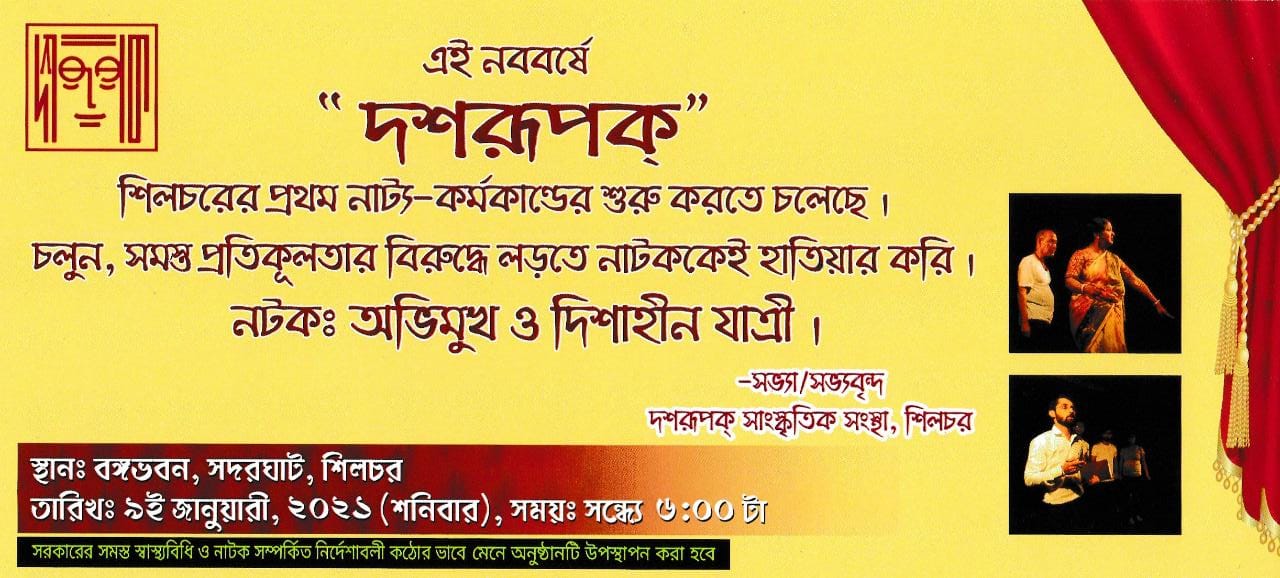 ৭ জানুয়ারিঃ চলুন, সমস্ত প্রতিকূলতার বিরুদ্ধে লড়তে নাটককেই হাতিয়ার করি। এই আহ্বান জানিয়ে ২০২১ সালের শুরুতে নাট্য-কর্মকাণ্ড শুরু করে দিয়েছে দশরূপক। আগামী ৯ জানুয়ারি শনিবার সন্ধ্যায় বঙ্গভবন প্রেক্ষাগৃহে মঞ্চস্থ হবে নাটক অভিমুখ ও দিশাহীন যাত্রী।