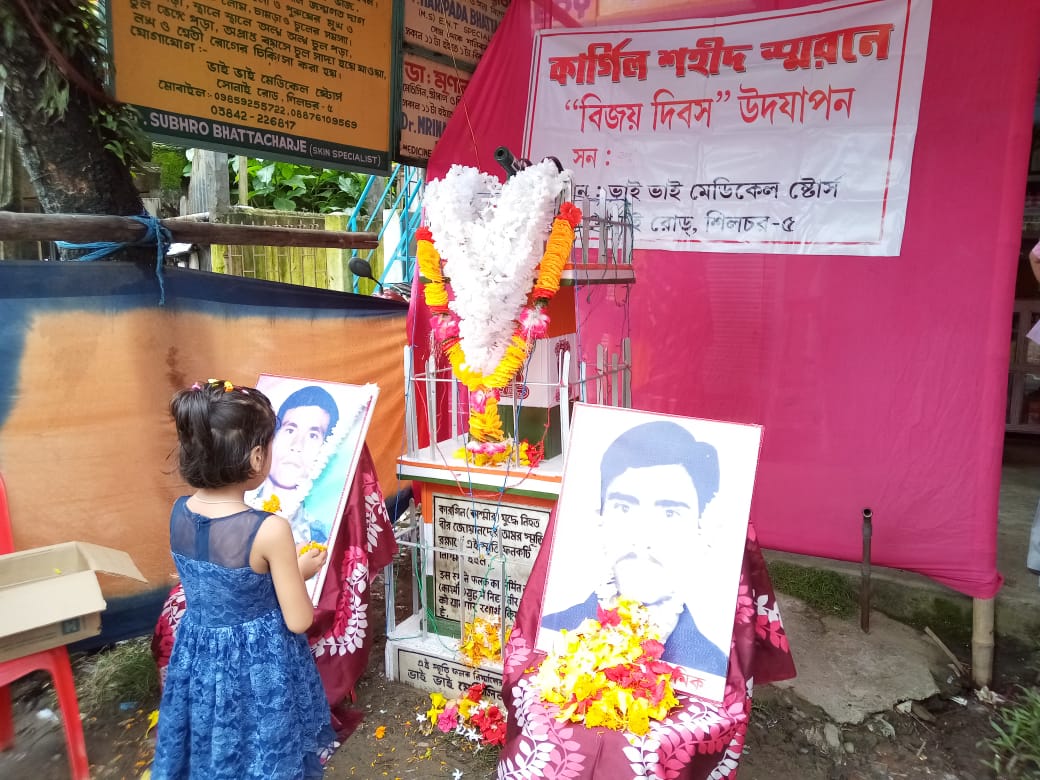 ২৬ জুলাইঃ ২১-তম কারগিল বিজয় দিবস শুক্রবার শিলচরেও যথাযথ মর্যাদায় পালন করা হয়েছে। এ দিন শিলচর সোনাই রোডের ভাইভাই মেডিসিন স্টোর্সের সামনে এক অনুষ্ঠানের আয়োজন করা হয়। এতে উপস্থিত সবাই কারগিল শহিদদের পুষ্পার্ঘ অর্পণ করে শ্রদ্ধা জানান। সুশীল চক্রবর্তীর উদ্যোগে আয়োজিত এই অনুষ্ঠানে বিভিন্ন বয়সের মানুষ অংশগ্রহণ করেন।