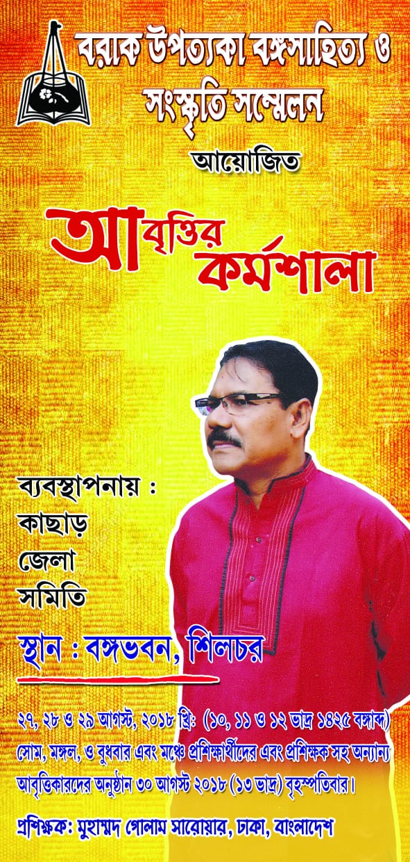 Barak Upottaka Banga Sahitto Sammelan is going to organize a Recitation Workshop at Banga Bhawan. The 3 day workshop will start from 27 August. The Resource person of this Recitation Workshop will be Mohammad Golam Saroyar from Dhaka. A detailed programme has been chalked out in this regard. The workshop has been scheduled from 4 PM to 8 PM. on all the three days. On 30 August, there will be a performance by the trainees along with the Resource Person.