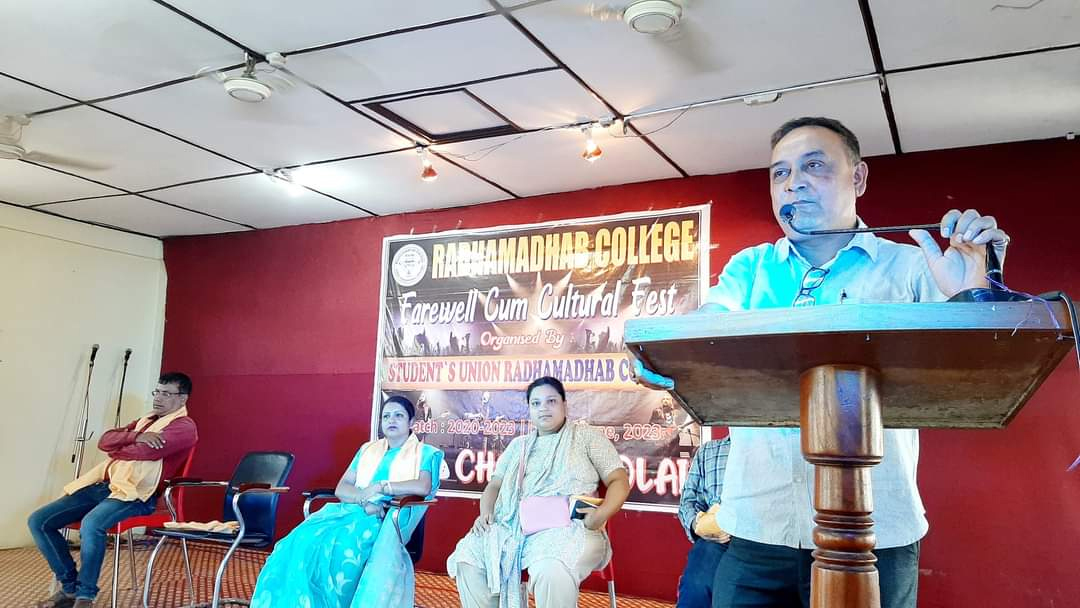 ওয়ে টু বরাক, ১০ জুন ঃ রাধামাধব কলেজ ছাত্র সংসদের উদ্যোগে শুক্রবার কলেজ প্রেক্ষাগৃহে স্নাতক ষষ্ঠ সেমিষ্টারের ছাত্রছাত্রীদের বিদায় সংবর্ধনা প্রদান উপলক্ষে এক মনোজ্ঞ সাংস্কৃতিক অনুষ্ঠানের আয়োজন করা হয়। এ দিন কলেজ প্রেক্ষাগৃহে প্রদীপ প্রজ্জ্বলনের মাধ্যমে বিদায় সংবর্ধনা ও সাংস্কৃতিক অনুষ্ঠানের সূচনা করেন আইকিউএসি-র কো-অর্ডিনেটর ড. সোনালি চৌধুরী। মঞ্চে উপস্থিত ছিলেন শিক্ষা বিভাগের বিভাগীয় প্রধান ড. সন্তোষ বরা, ইংরেজি বিভাগের সহকারী অধ্যাপক ড. অরুণাভ ভট্টাচার্য, বাংলা বিভাগের সহকারী অধ্যাপক ড. কালীপদ দাশ ও দর্শন বিভাগের সহকারী অধ্যাপিকা স্বর্ণালী রায় চৌধুরী।