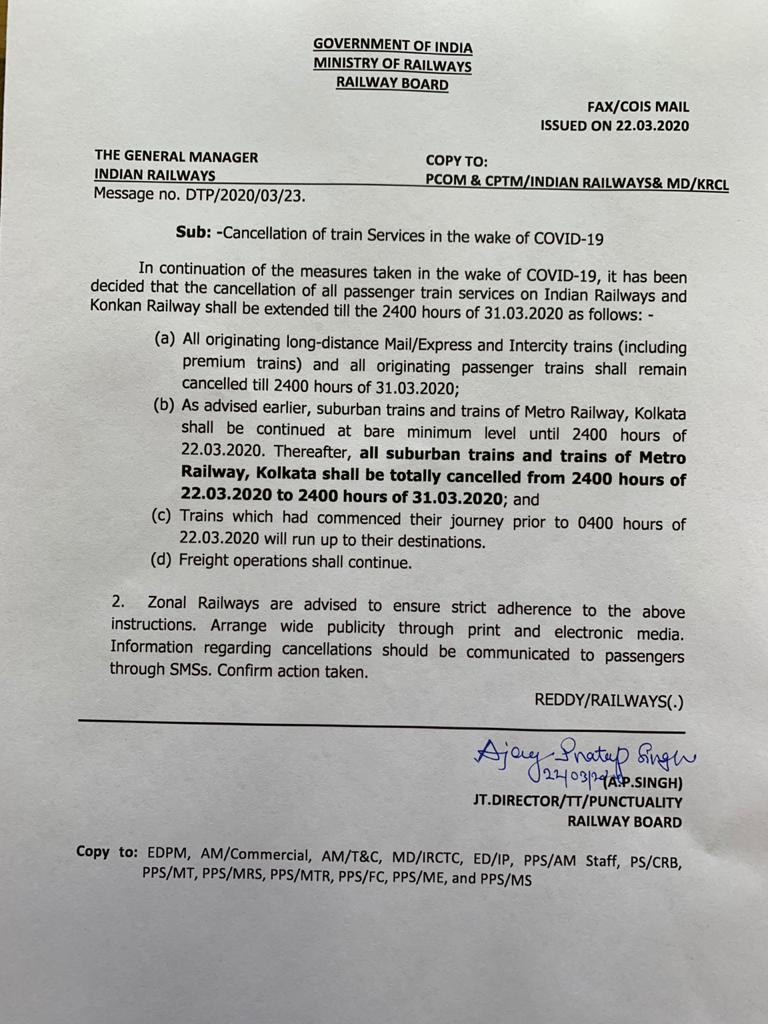২২ মার্চ: আগামী ৩১ মার্চ পর্যন্ত সমস্ত ধরনের যাত্রীরেলের চলাচল বাতিল করা হয়েছে৷ ভারতীয় রেল রবিবার সিদ্ধান্ত নিয়েছে, করোনা ভাইরাস ঠেকাতে এরা কোনও ট্রেন চালাবে না৷ বন্ধ থাকবে মেট্রোও৷ তবে মালগাড়ি যথারীতি চলবে৷