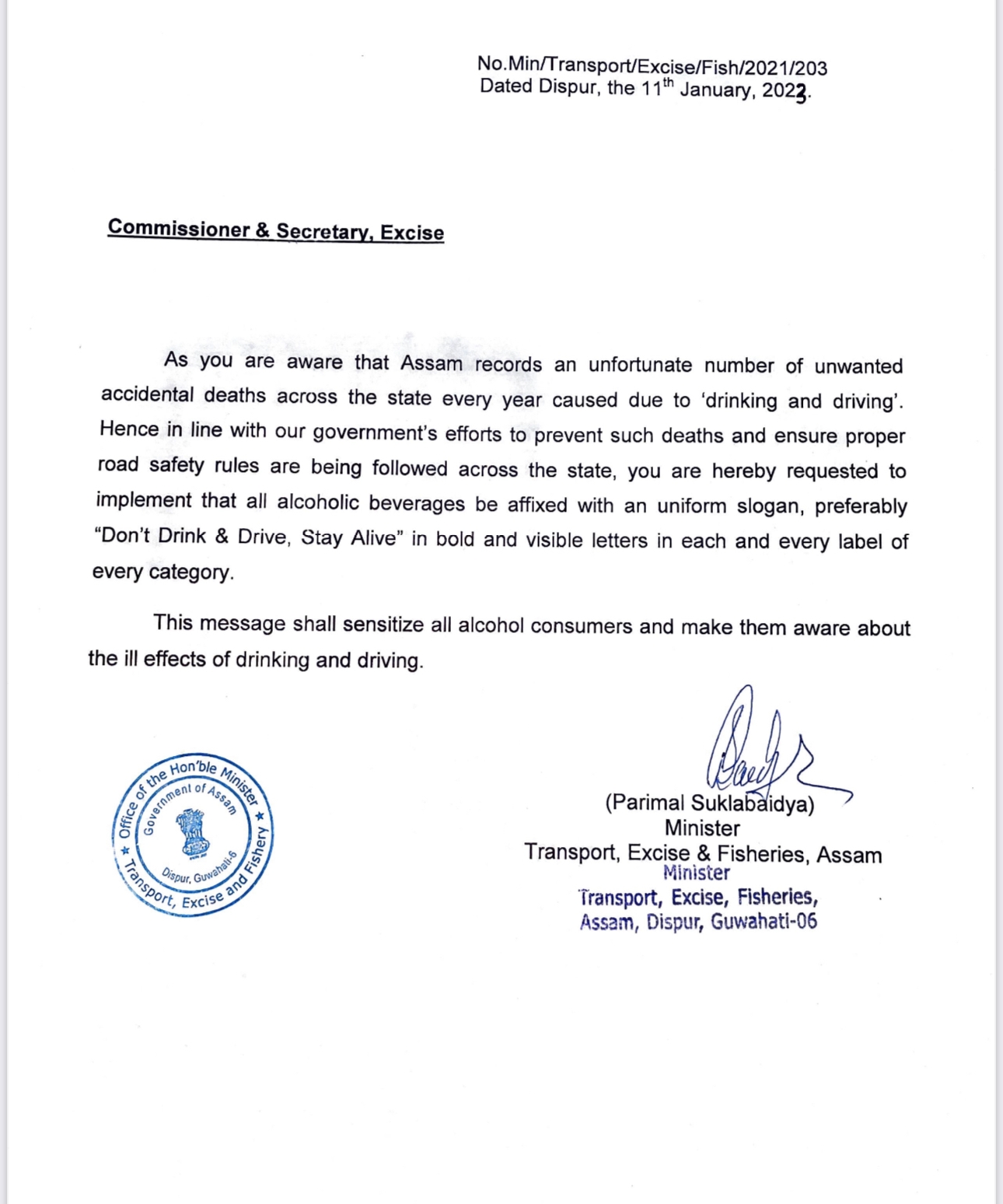 ওয়েটুবরাক, ১১ জানুয়ারি : গাড়ি চালানোর সময় মদ্যপান নয়, সব ধরনের মদের বোতলে এই লেবেল সেঁটে দিতে হবে৷ জাতীয় সড়ক সুরক্ষা সপ্তাহে আবগারি বিভাগের কমিশনার-সচিবকে চিঠি লিখে প্রয়োজনীয় ব্যবস্থা নিতে বলেছেন অসমের আবগারি মন্ত্রী পরিমল শুক্লবৈদ্য৷ তিনি বলেন, মদ খেয়ে গাড়ি চালানোর জন্য রাজ্যে দুর্ঘটনা বেড়ে চলেছে৷ এই সব প্রতিহত করতে সরকারকেও কিছু কাজ করতে হবে৷ মন্ত্রীর আশা, লেবেল সাঁটা দেখলে মদ্যপায়ীরা কিছুটা হলেও সতর্ক হবে৷
