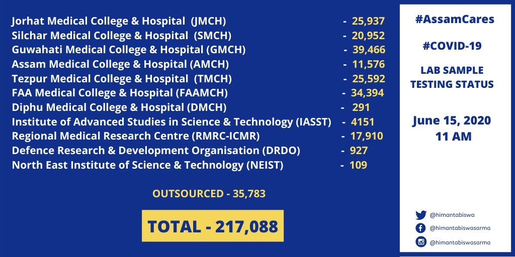 Pleased to share that pursuing our policy of proactive & aggressive testing for #COVID19, Assam Govt has completed 2.17 lakh tests. We've been carrying out approx 10,000 tests per day after having ramped up our capacities.