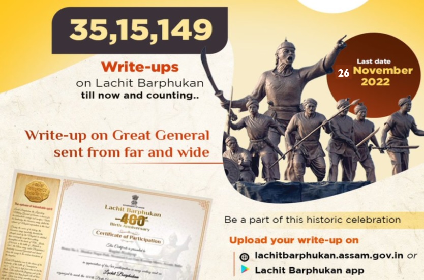 way2barak, Nov.24: In view of public demand, Assam government has decided to extend the deadline of sending write-up on Lachit Barphukan by 2 more days till midnight of 26 November, 2022. Upload your write-up on lachitbarphukan.assam.gov.in or Lachit Barphukan app. This was stated by Chief Minister Dr Himanta Biswa Sarma in a tweet on Thursday night. Till now, more than 40 lakh write-ups were sent by the participants and the number is ever increasing.
