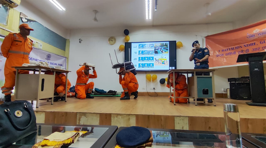 Officials from the district’s DDMA and NDRF were present to give lessons on disaster management. A mock drill on disaster management was also organized with their participation. The students also gained general knowledge through this presentation on what to do during a disaster.
