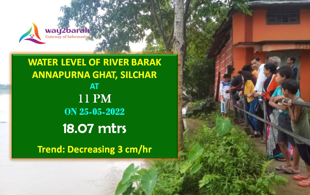 May 25: Due to incessant rainfall since the last few days, the water level of river Barak started to rise. However,  since Monday, the water level at Annapurna Ghat was gradually decreasing and came down much below the danger level.
