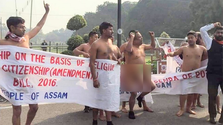 January 7: On last Friday, Prime Minister Narendra Modi during a rally at Silchar in Assam declared that his government is moving ahead with the Citizenship (Amendment) Bill, 2016. He assured to pass this bill in the ongoing winter session of the Parliament. Krishak Mukti Sangram Samiti (KMSS) marched nude on the road in New Delhi leading to Parliament and shouted slogans against the Centre’s move to table the Bill in the Parliament. Protesters took to the streets and raised “Bangladeshis, go back” slogans. The activists covered themselves in banners along the busy streets of Vijay Chowk.