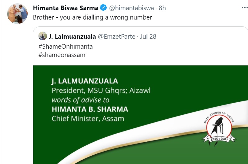 July 29: Mizo Students’ Union (MSU) President J. Lalmuanzuala taking to his twitter handle on 28 July issued a letter threatening Assam Chief Minister Dr Himanta Biswa Sarma. Using hashtag #ShameOnhimanta & #Shameonassam wrote, “Before your entrance into the world of politics, there was peace among the Northeast States under the umbrella of the nomenclature ‘Seven Sisters’. However, your disrespect and disregard to this unity because of your personal political ambitions even to the point of death have threatened and shaken the peace among the sisters. In short, you have made enemies with all your neighbouring Northeast States.”
