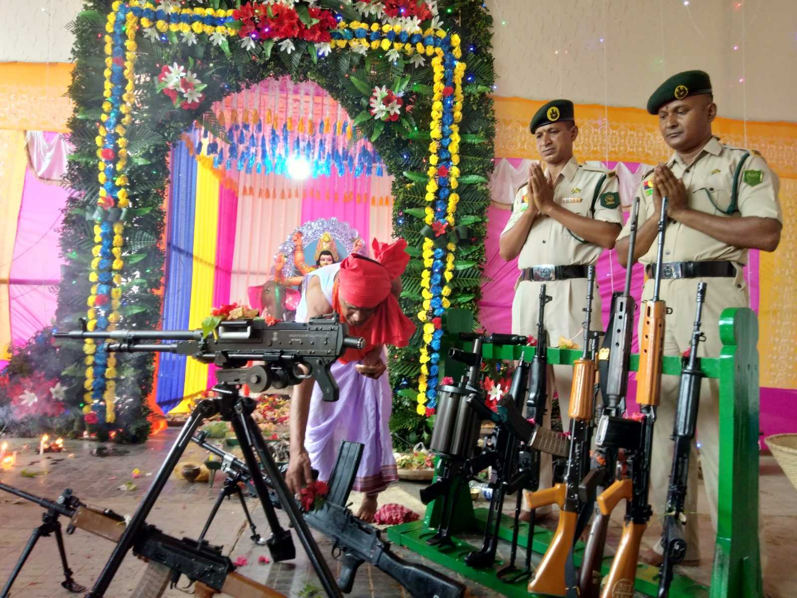 TSR officers said that in addition to the customary worshipping of arms and ammunition on the occasion of Vishwakarma Puja, there is a distinctive practice of worshiping weaponry in all the 14 battalion headquarters across the state.