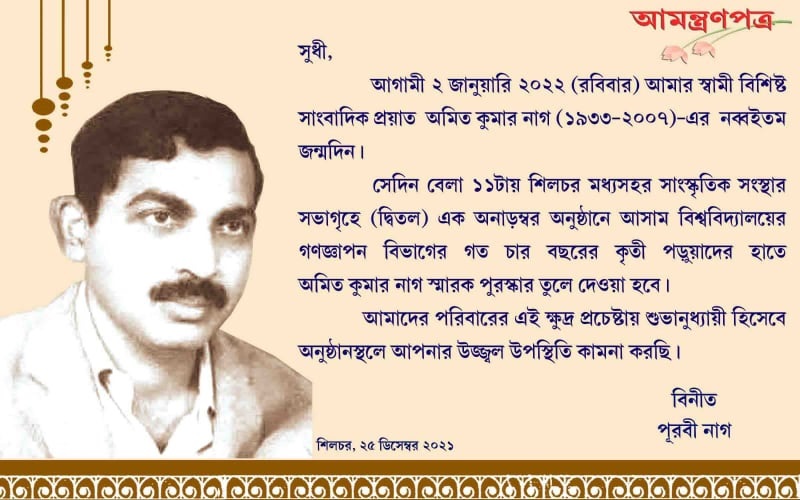 Informing this, Purabi Nag, wife of Late Amit Kumar Nag stated that the award ceremony will be held at 11 AM on 2 January, 2022 at the conference hall (1st floor) of Madhya Sahar Sanskritik Sangstha, Park Road, Silchar. Mrs. Nag appealed to all to grace the occasion and make their humble efforts successful. It needs mention here that Late Amit Kumar Nag’s son Dr Apratim Nag is serving as an Associate Professor in the Department of Physics, GC College, Silchar.
