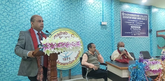 Earlier, Principal of the college Dr Debashish Roy delivered the welcome address. Er Angshu Kumar Roy also thanked the MP for taking keen interest in the progress and development of Radhamadhab College. In his address, the President of the Governing Body, LK Bhattacharjee spoke about staring Science stream in the college very soon. Arunabha Bhattacharjee, Asstt Professor of English delivered the vote of thanks. The programme was compered by Sudarshan Gupta, Head of the Department of History.