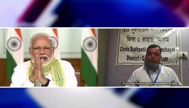 ২৪ এপ্রিলঃ পঞ্চায়েত রাজ দিবস উপলক্ষে প্রধানমন্ত্রী নরেন্দ্র মোদি শুক্রবার দেশের পঞ্চায়েত প্রতিনিধিদের উদ্দেশে বক্তৃতা করেন। কথা বলেন বিভিন্ন প্রান্তের কয়েকজন জিপি সভাপতির সঙ্গে। অসম থেকেও তিনি একজন পঞ্চায়েত সভাপতির সঙ্গে মত বিনিময় করেন। আর ওই সভাপতি হলেন কাছাড় জেলার ছোট দুধপাতিল জিপি সভাপতি রঞ্জিত সরকার। মোদি মনোযোগ সহকারে তাঁর কথা শোনেন। রঞ্জিতবাবু বলেন, ছোট দুধপাতিল সহ বড়খলা এলাকা জুড়ে করোনা ঠেকাতে কাজ চলছে। তাঁরা এলাকার বাড়ি বাড়ি যাচ্ছেন। চালের সঙ্গে ওষুধও বিলি হচ্ছে। কার কী প্রয়োজন নিয়মিত খোঁজ নিচ্ছেন। হাত ধোয়া, সোশ্যাল ডিসটেন্সিং ইত্যাদি ব্যাপারে সচেতন করছেন। প্রবীণ মানুষের খোঁজখবর রাখছেন। রঞ্জিতবাবু মোদির সঙ্গে কথা বলতে গিয়ে মুখ্যমন্ত্রী সর্বানন্দ সোনোয়াল, স্বাস্থ্যমন্ত্রী হিমন্ত বিশ্ব শর্মা এবং বিধায়ক কিশোর নাথেরও প্রশংসা করেন।