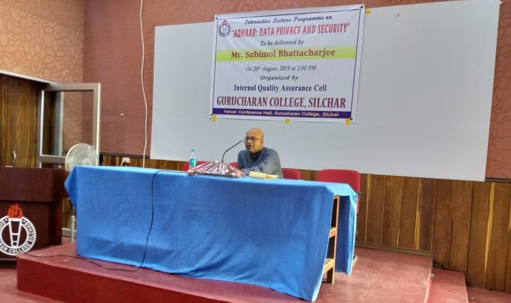 August 20: Security is a vast space, right from the security guard in front of your building to the complicated lines of code that keep away hackers from your database. If I am able to get past your walls be it physical or digital, it’s a clear security breach. We could start playing the blame game here. You need to start to educate yourself about how security works, especially when you give away your sensitive information to people who may not be so concerned about your security. These were the words of caution uttered by cyber security expert Subimal Bhattacharjee while speaking at G.C. College, Silchar. On Tuesday, Mr. Bhattacharjee delivered a lecture on “Aadhar: Data privacy and security” in the prestigious college of Barak Valley, which was attended by the faculty members and students of the college.