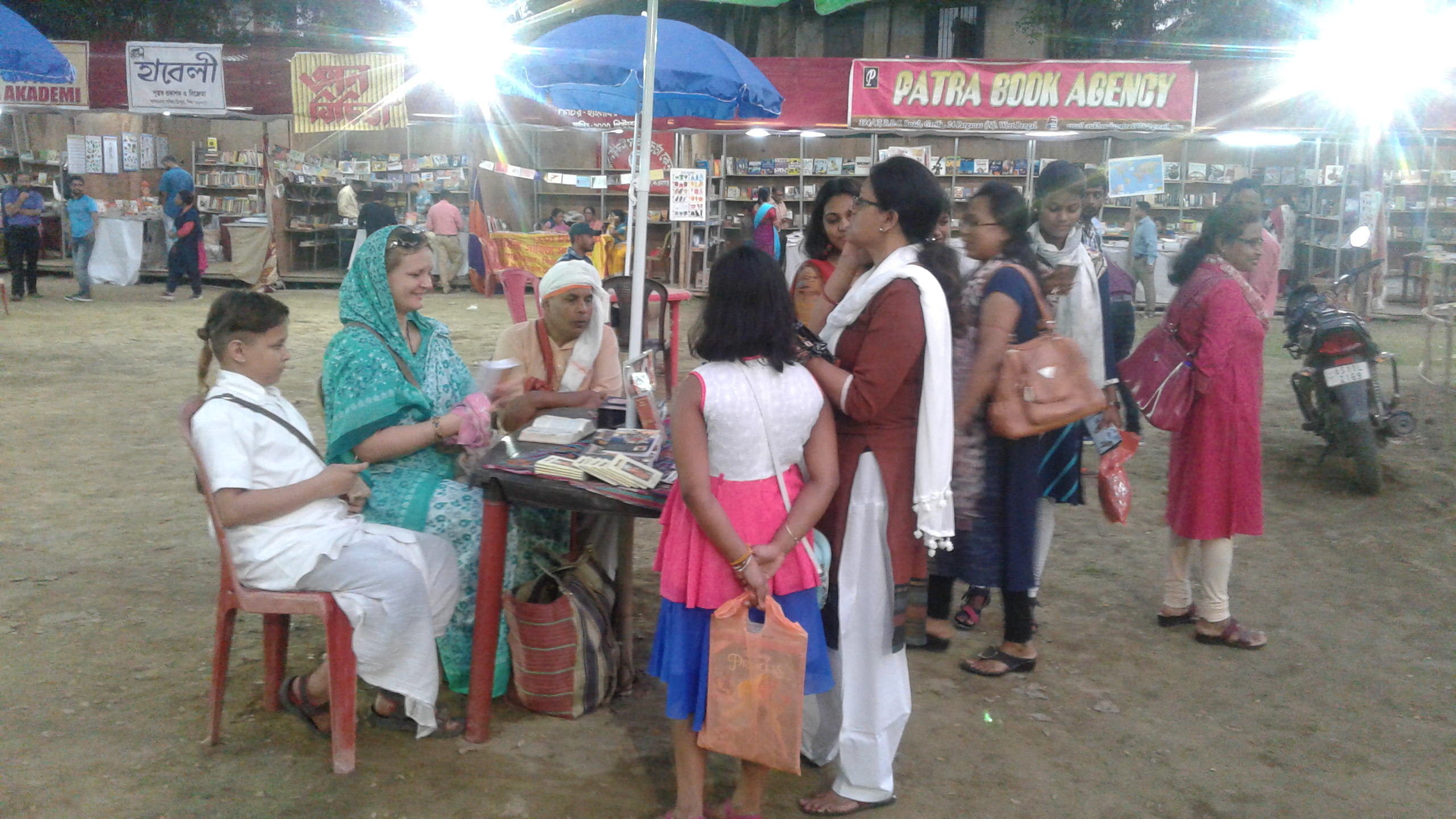 ১৯ নভেম্বরঃ বইমেলার শেষদিনে নজর কাড়লেন রুশ মহিলা। ছাতা টাঙিয়ে ইসকনের বই নিয়ে বসে পড়লেন মেলায়। যত না বই দেখেছেন মেলার দর্শনার্থীরা, এর চেয়ে বেশি তাকিয়েছেন তাঁর দিকে। যিনি যাচ্ছেন, তাঁকেই হাতজোড় করে স্বাগত জানাচ্ছেন সুমুখী দেবীদাস। ভাঙা বাংলায় বইয়ের কথা বুঝিয়ে বলার চেষ্টা করছেন।