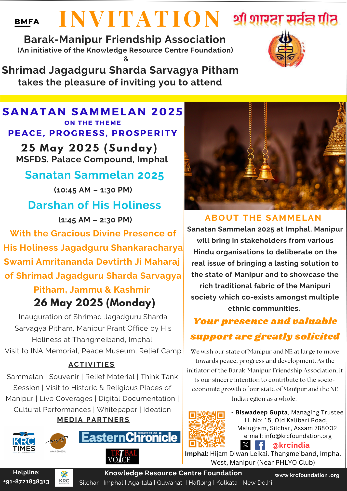 way2barak, May 20 : Sanatan Sammelan 2025, to be held on 25th May 2025 at Manipur State Film Development Society (MSFDS), Palace Compound Imphal, organised by the KRC Foundation, under the aegis of Shrimad Sharda Sarvagya Pitham, Jammu and Kashmir and in collaboration with the Barak-Manipur Friendship Association.