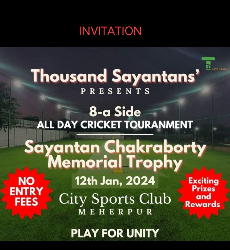 way2barak, Jan 11: On the occasion of National Youth Day, Swami Vivekananda’s birth anniversary, Thousand Sayantans’ is going to organise “SAYANTAN CHAKRABORTY MEMORIAL TROPHY” Cricket Tournament among reputed clubs and NGOs of Barak Valley at City Sports Club, Meherpur at 9 a.m.