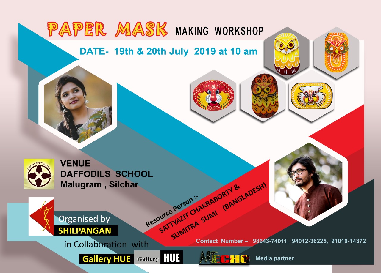 Shilpangan in collaboration with Gallery Hue will be organising this ‘Paper Mask Making Workshop’ on 19 and 20 July, 2019 at Daffodils High School, Malugram, Silchar. The workshop will begin at 10 AM on 19 July. The two resource persons of the workshop are Sattyazit Chakraborty and Sumitra Sumi from Bangladesh. Both of them are experts in this field of making paper mask and have earned great reputation.