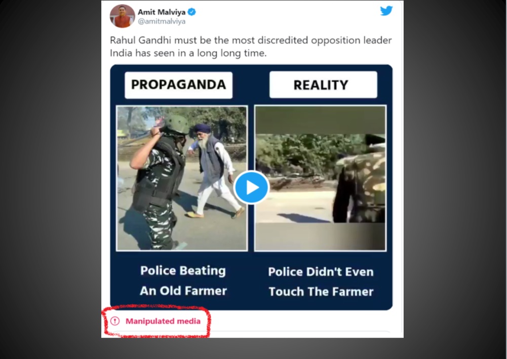 Dec. 2: Social media giant Twitter has started tagging fake news on Twitter India and the first person in Indian politics whose tweet was labelled as ‘manipulated’ was that of Amit Malviya, IT Cell Head of Bharatiya Janata Party (BJP). In the tweet in question, Malviya was responding to a post by Congress leader Rahul Gandhi. Gandhi had tweeted a photograph showing a policeman wielding his baton against a protesting elderly farmer, writing in Hindi: “It is a very sad photo. Our slogan was ‘Jai Jawan Jai Kisan’ but today PM Modi’s arrogance made the jawan stand against the farmer. This is very dangerous.”