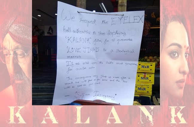 April 20: Posters were put up in front of all the multiplex and cinema halls of Silchar wherein strict warning was given not to screen the Hindi Feature Film ‘Kalank.’ At present, film ‘Kalank’ is shown in all the shows at Eylex in Goldighi Mall and Gold Cinema at Sadarghat. It is also screened at Oriental Talkies. Identifying themselves as ‘Saffron Insurgency”, it was written in the posters outside the halls that ‘Kalank’ depicts ‘Love Jihad’ and so this movie is no to be screened. It was further threatened that, if their dictates are not obeyed then the cinema hall owners will be responsible for any loss or damage which will take place.