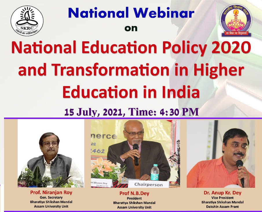 July 13: A national level webinar on “National Education Policy, 2020 and Transformation in Higher Education in India” has been organised by SK Roy College,Katlicherra in collaboration with Bharatiya Shikshan Mandal (BSM), Assam Visvavidyalaya Samithi. The webinar will be held on 15 July, 2021 at 4.30 PM. The resource persons of the webinar are Prof Niranjan Roy, General Secretary of BSM, AU Unit, Prof. NB Dey, President of BSM AU Unit and Dr Anup Kumar Dey, Vice President of BSM AU Unit. E-certificates will be provided to all the participants. For further query, participants may call 8486742989, 9435377528. The link for joining the webinar is meet.google.com/esx-ndbe-khp.